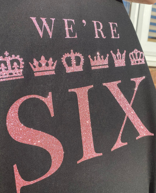 SIX show t-shirts and hoodies feature exclusive, custom designs created for fans of the musical. Each piece displays unique artwork inspired by the show, offering a special way to celebrate SIX with playful phrases like “Sorry Not Sorry” and “We’re SIX.”